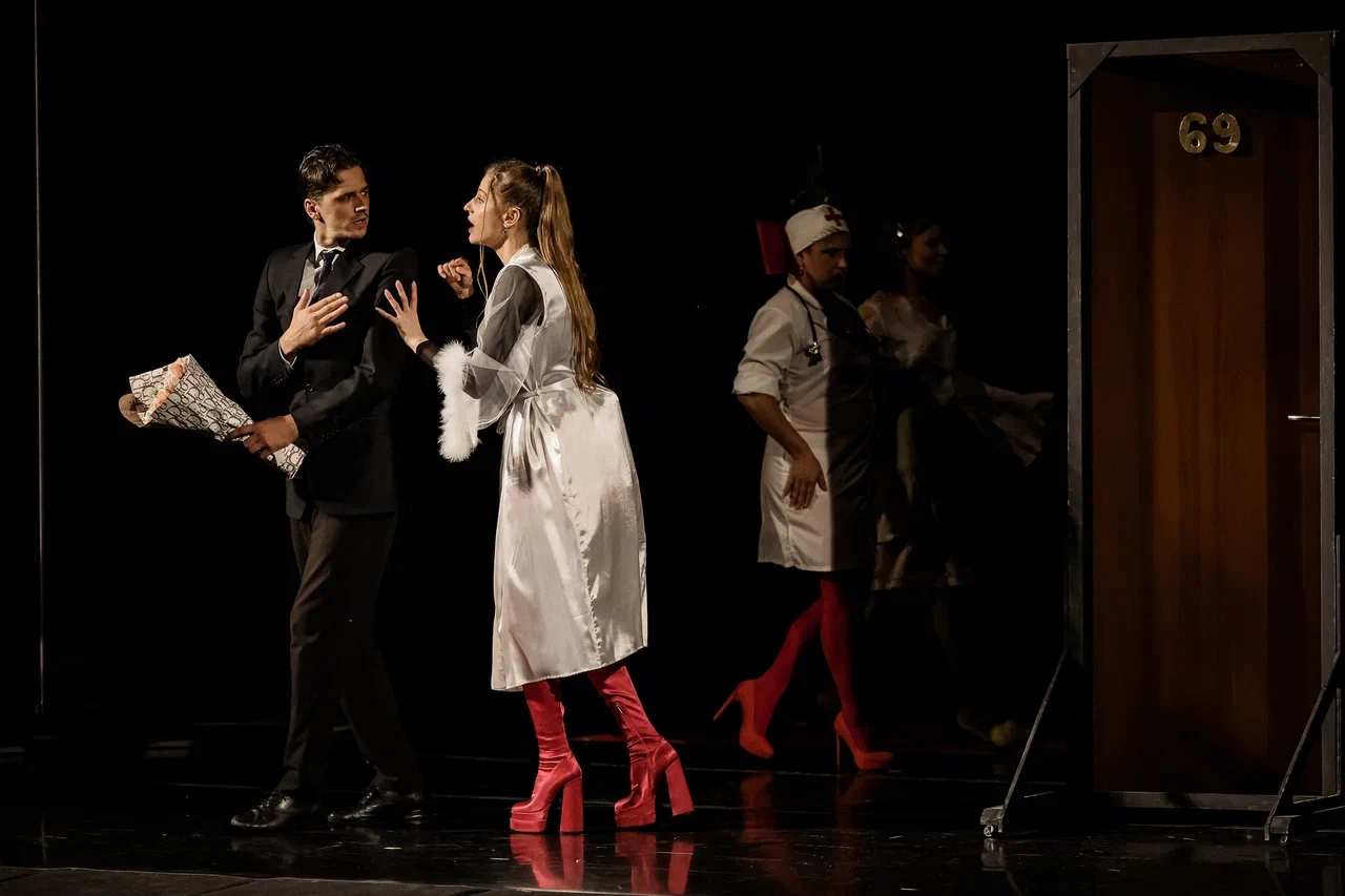 Конкурсную программу третьего дня фестиваля «Территория жеста» продолжил спектакль московского Театра Мимики и Жеста «Четыре невесты сантехника Струева» — динамичная, насыщенная событиями комедия положений, поставленная артистом театра Игорем Стрелкиным. Ее действие разворачивается в обычной московской квартире, где однажды собираются четыре женщины — бывшие невесты одного мужчины. Несмотря на трагикомичность происходящего на сцене, постановка оставила ощущение легкости и веселья. Музыкальные акценты дополняли общую картину, придавая действию динамику и подчеркивая ключевые моменты истории.