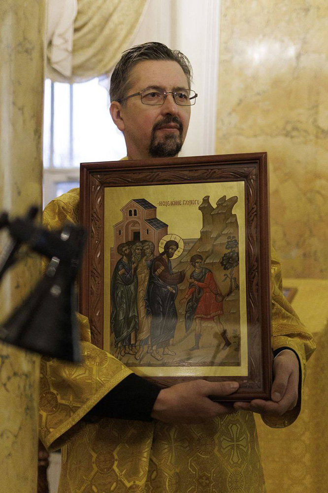 Отец Димитрий Симонов, в свою очередь, подарил владыке Варсонофию икону «Исцеление глухого» — копию храмового образа — с пожеланиями прихожан на обратной стороне.
