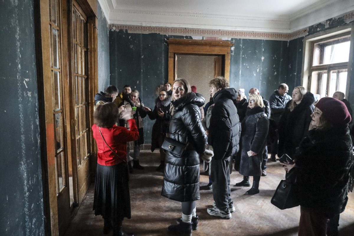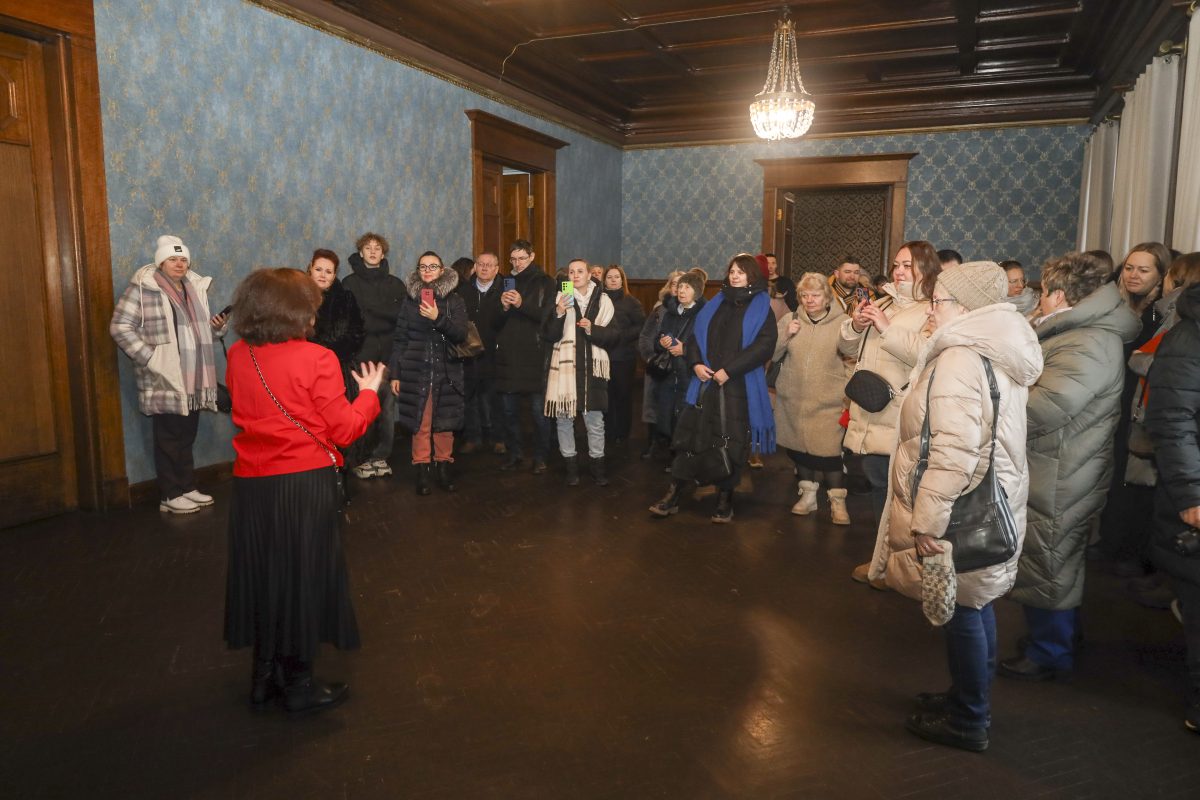 Мария Васильева провела гостей по залам и коридорам дворца. Гости фактически увидели, как дворец выглядел изначально. Осмотрели оригинальные интерьеры: мраморную лестницу, кабинет с эркером и встроенным книжным шкафом, гостиную, библиотеку. В бывшей столовой сохранились двери, обшивка стен, зеркало в стиле модерн и даже батареи. Уцелели также три камина из белого и цветного мрамора, раздвижные двери из карельской березы, каркас лифта, оконная фурнитура.