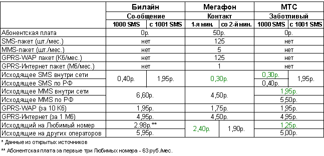 • у МТС и «Мегафон-Москва» наиболее низкая стоимость исходящих SMS-сообщений внутри «домашней» сети
