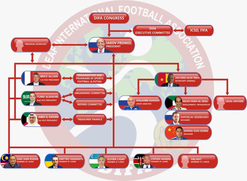 Яков Френкель рассказал о создании турниров для молодежных команд по спорту глухих (футбол), где будут соревноваться команды 21-летних и 23-летних юношей. Планируется множество состязаний в этой возрастной категории. Более подробную информацию можно найти на сайте DIFA (difa.org). Яков Матвеевич заметил, что произошли некоторые перестановки в исполнительном комитете DIFA и показал схему с обновленным составом исполкома.