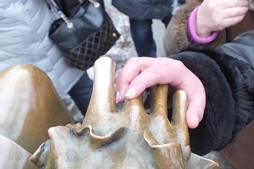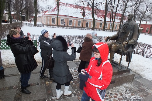 У памятника Петра I мы сделали остановку. Памятник выполнен из бронзы. На постаменте выбита надпись: «Основателю Великого Града Российского императору Петру Первому от Итальянского скульптора Карло Растрелли и от русского художника Михаила Шемякина. 1991 год. Отлита в Америке». Это содержательное сообщение говорит о том, что памятник выполнен скульптором Шемякиным, в своей работе использовавший прижизненную маску царя, снятую К.-Б.Растрелли в 1717 году. Таким образом, это максимально приближенное к исторической реальности лицо Петра.