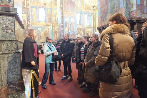 После обеда мы посетили Храм Спас-на-Крови , который является музеем и памятником русской архитектуры. Был возведен по указанию Александра III и решению Синода на том месте, где 1 марта 1881 года народоволец И. Гриневицкий смертельно ранил Александра II, которого в народе называли Царем-Освободителем за отмену крепостного права.