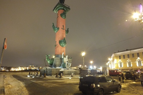 Первое пешее наше знакомство с Питером свершилось на берегу Невы, где мы увидели ростральные колонны, некогда служившие маяками, а ныне являющимися светочами, на которых в праздничные дни загораются огни. Ростральные колонны (лат. columna rostrata, от лат. Rostrum – нос корабля) украшены носами кораблей (рострами) и скульптурными изображениями. Обычно ростральные колонны воздвигались в честь морских побед или как символ морского могущества страны.