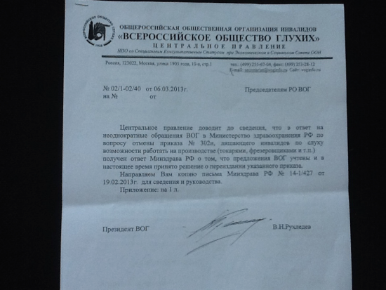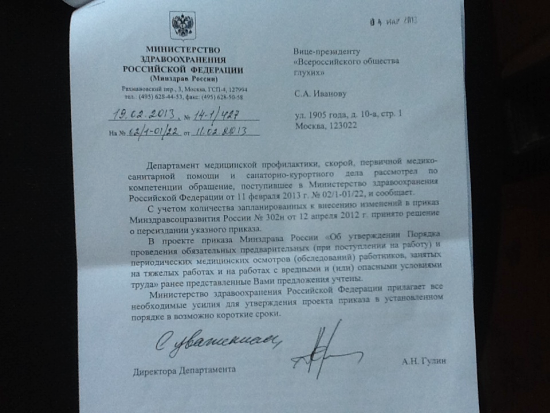 Не знаю, то ли Минздрав стремительно откликнулся именно на выступление на трибуне Организации Объединенных Наций президента Всероссийского общества глухих, то ли, все-таки, услышали то, что Валерий Никитич бесконечно доказывал на каждом углу здесь, в России целый год, говоря о недопустимости издания Министерством здравоохранения России подобных дискриминационных нормативных актов, не то что запрещающих устраиваться, а и элементарно поставивших на грань потери рабочего места уже работающих, но неделю назад Мордовское РО ВОГ получило из Москвы письма, дающие нам шанс на надежду. Копию этих писем предоставляем вашему вниманию.