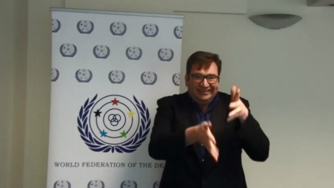 , исследователя Центра когнитивных исследований глухоты и языка Университетского колледжа Лондона (Великобритания), разъясняющего на международных жестах суть данного Заявления ВФГ.
