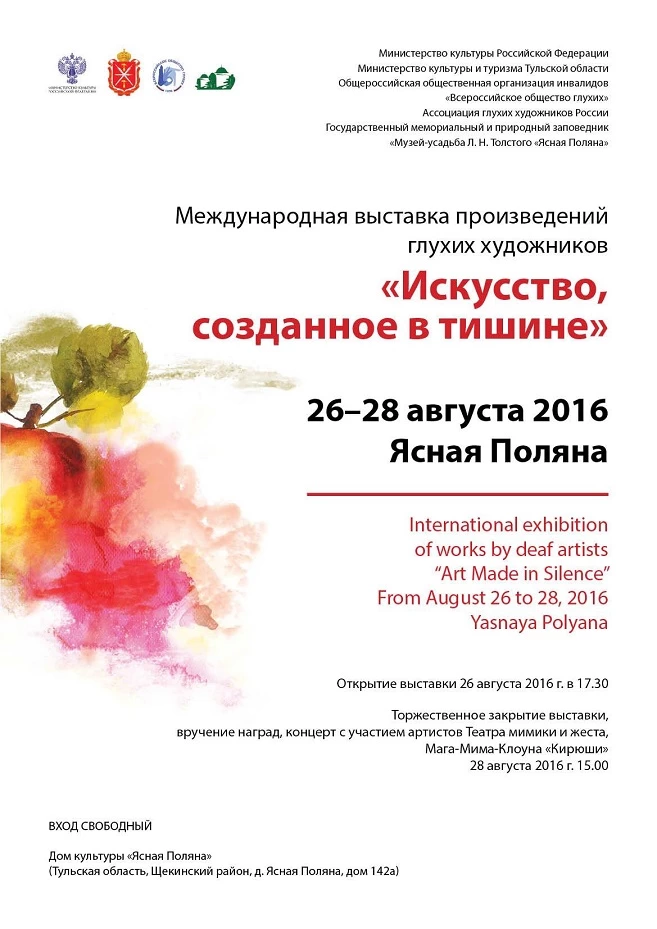 26-28 августа в ДК «Ясная Поляна» пройдет Международная выставка произведений глухих художников «Искусство, созданное в тишине». В ней примут участие 30 неслышащих мастеров изобразительного искусства из России, Беларуси, Украины, Франции и Италии. Выставка организована ОООИ «ВОГ», Ассоциацией глухих художников России и Государственным мемориальным и природным заповедником «Музей-усадьба Л. Н.Толстого «Ясная Поляна».