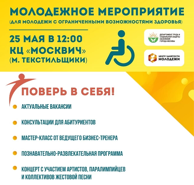 Приглашаем всех желающих найти работу или продолжить учебу на ярмарку вакансий и учебных мест для молодых людей с ОВЗ, который состояится 25 мая 12:00 — 17:00 в КЦ «Москвич» в рамках проведения молодежного мероприятия «Поверь в себя!».