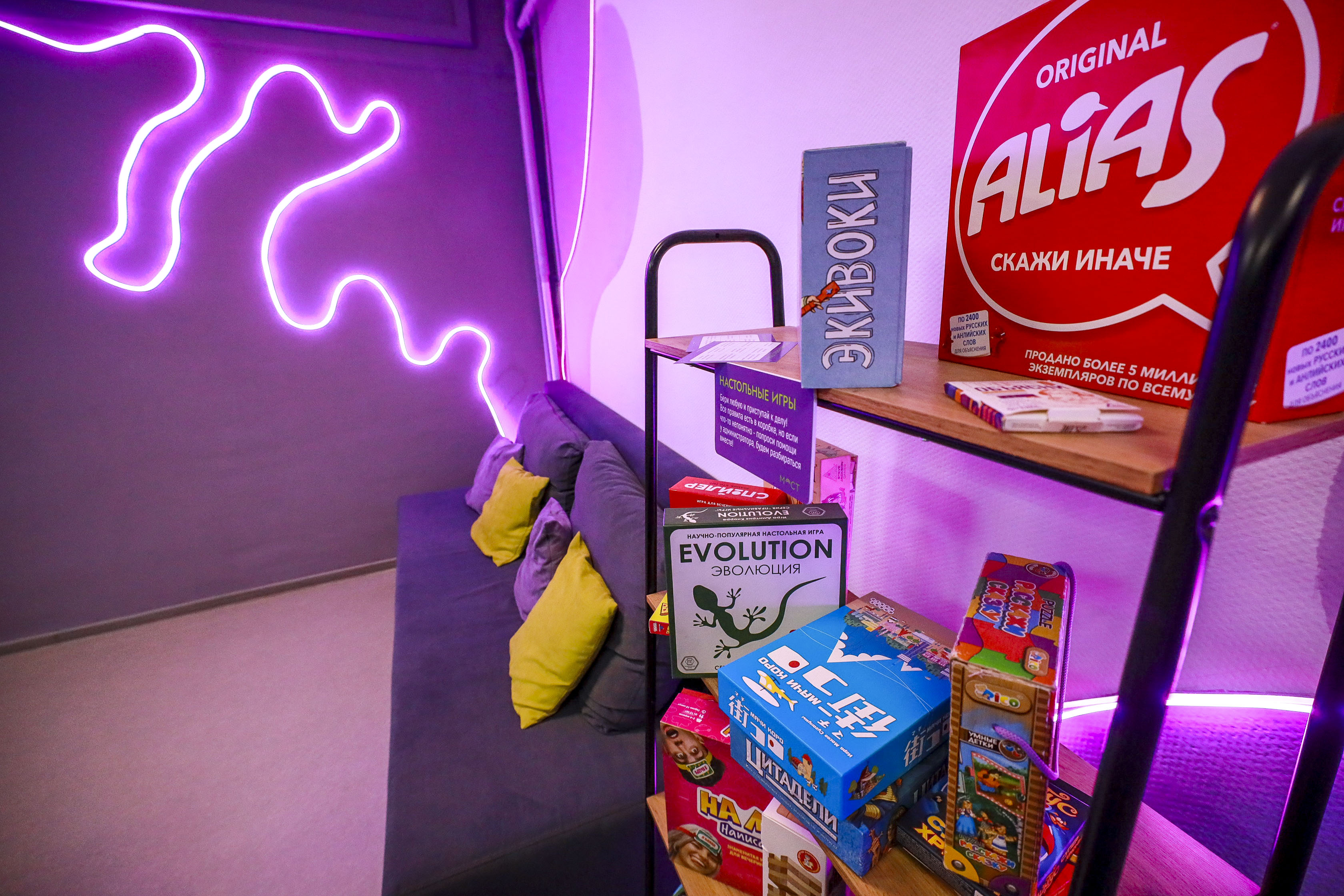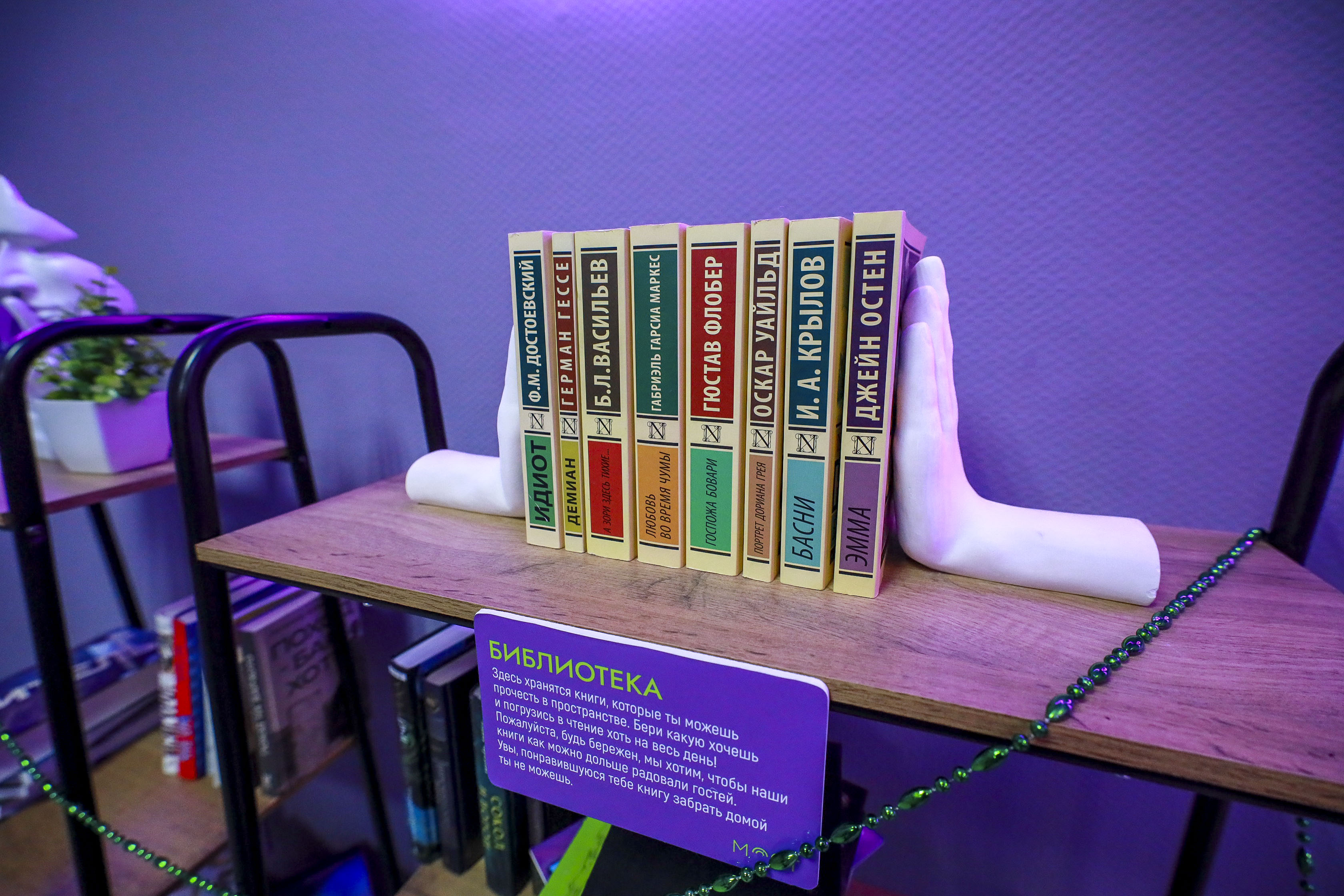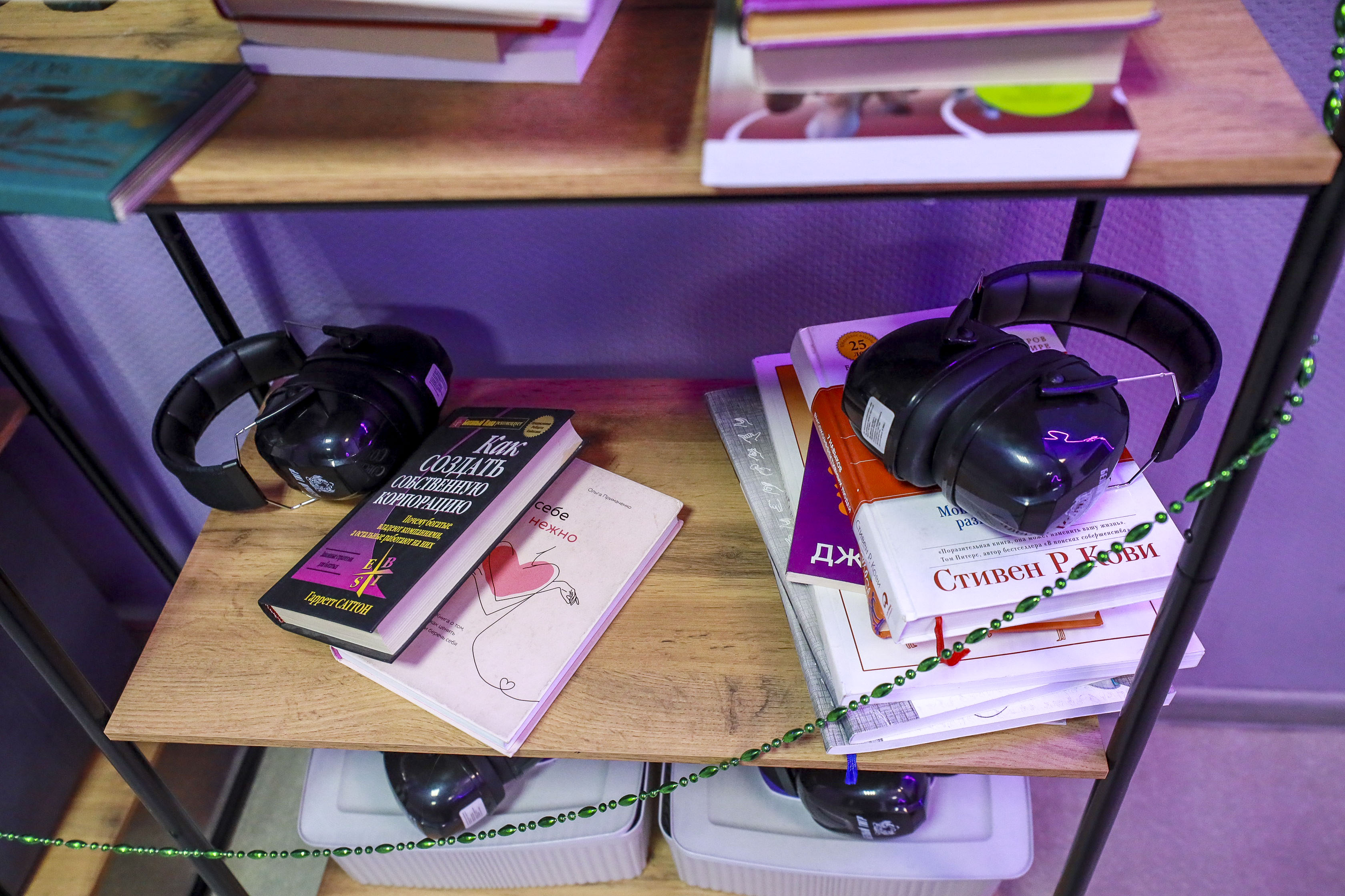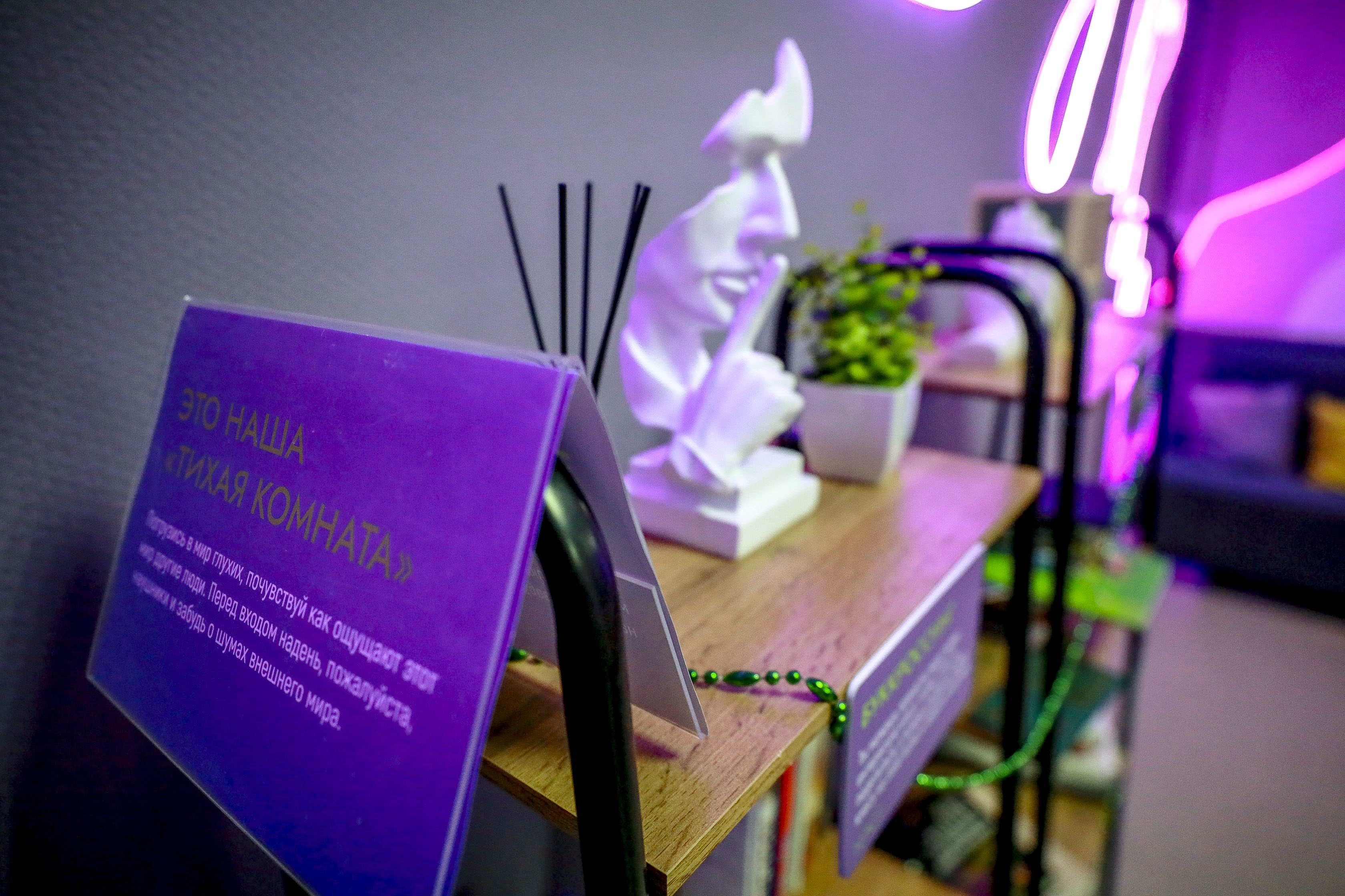 Многофункциональная комната тишины, в ней работают, учатся, ведут переговоры, играют в настольные игры, читают. Кстати, книги предоставляют — на стеллажах разместили буккроссинг и библиотеку. Слышащим гостям предлагают воспользоваться шумоизоляционными наушниками.