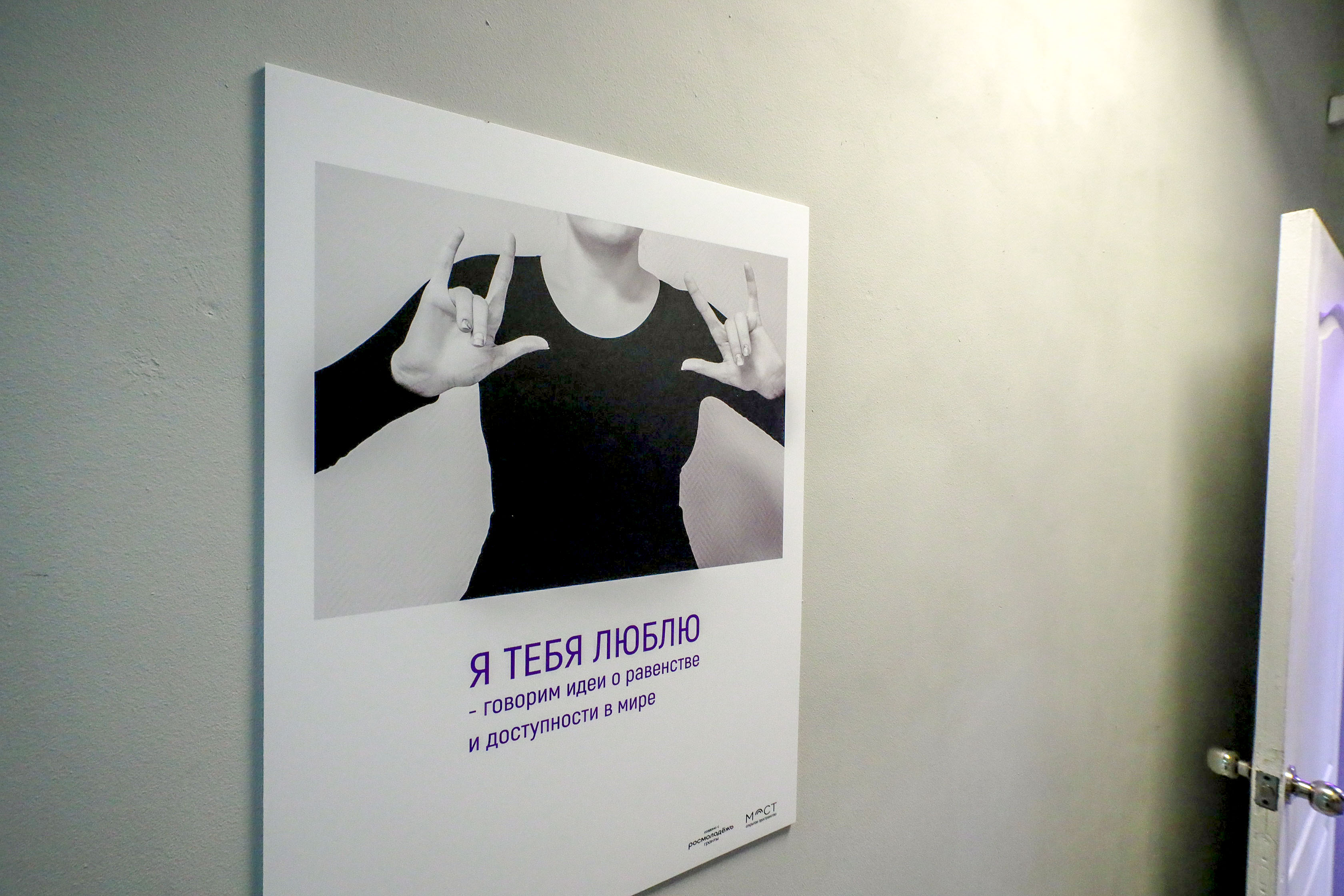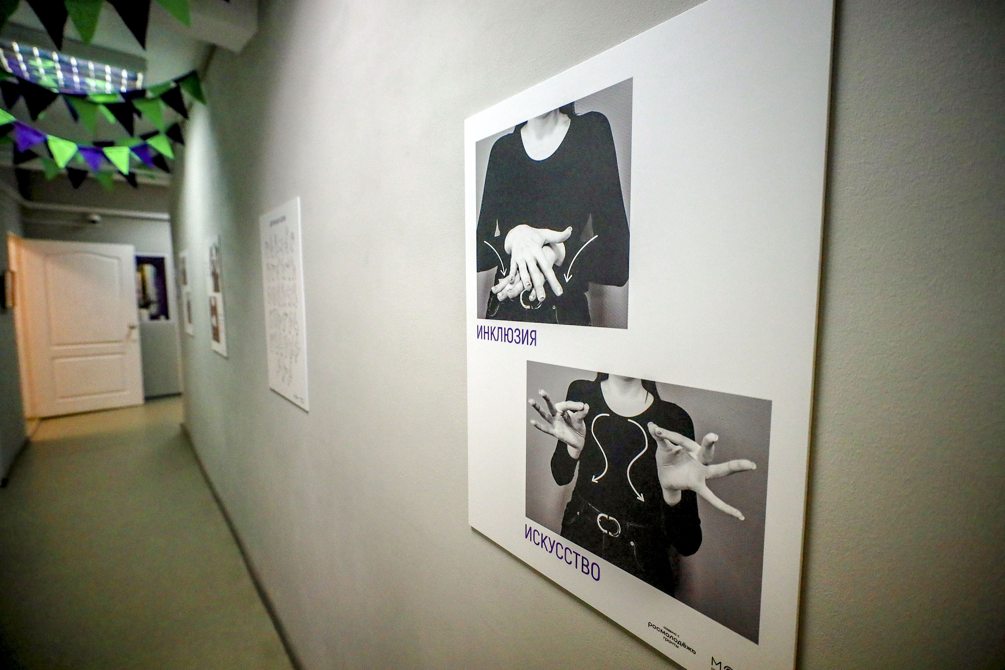 Небольшой холл украшают фотографии с жестами и дактильная азбука. Они показывают, как выглядят слова «Содружество», «Мост», «Здравствуйте», «До свидания», «Инклюзия».