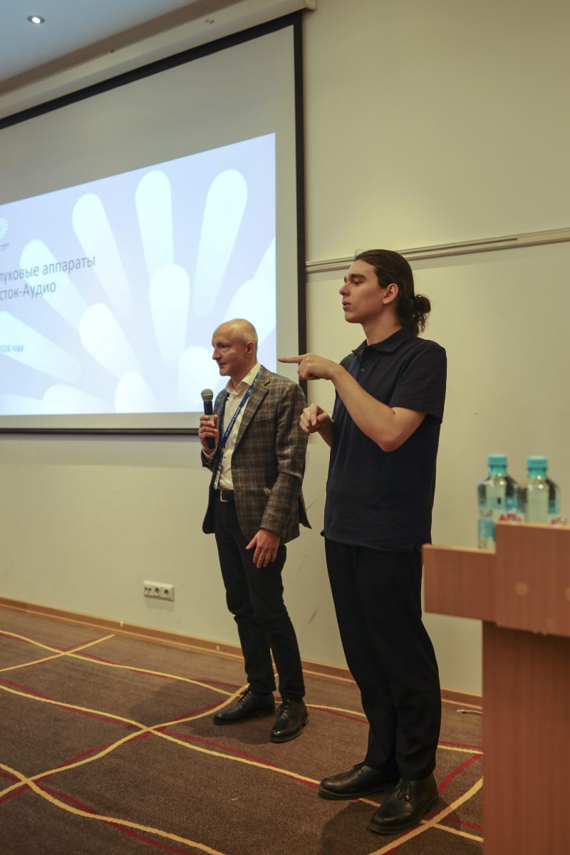 В продолжение выступления, ее коллеги, Никита Архипов и Григорий Соломенцев, представили подробные презентации об инновационных решениях в современном слухопротезировании и системах оповещения для глухих и слабослышащих людей.