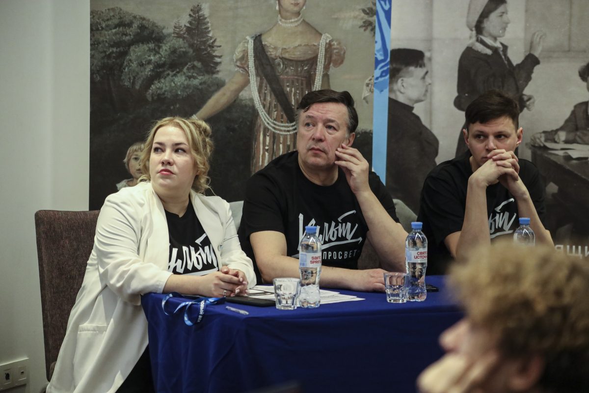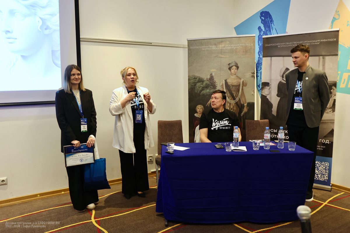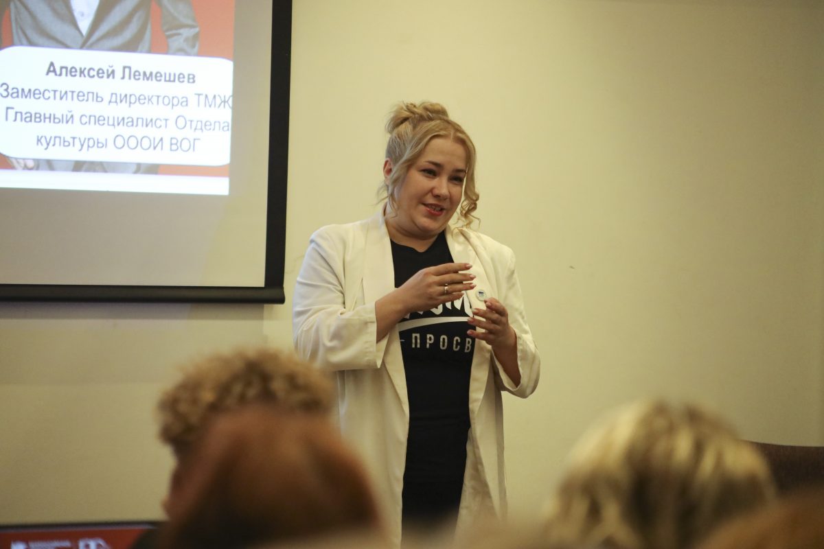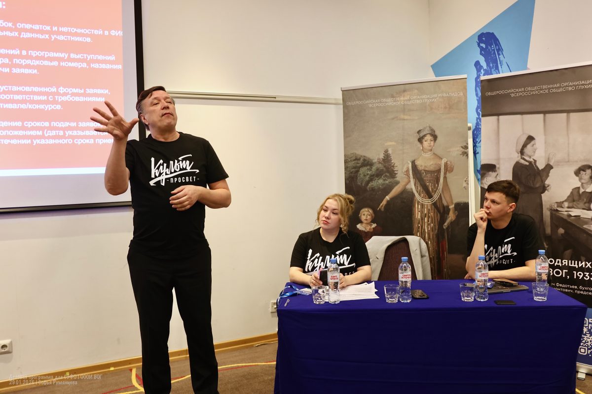 По очереди выступили спикеры культурного семинара: Анна Митрофанова, руководитель отдела культуры ОООИ ВОГ, Роберт Фомин, директор Театра мимики и жеста и Алесей Лемешев, актер и заместитель директора Театра Мимики и Жеста.