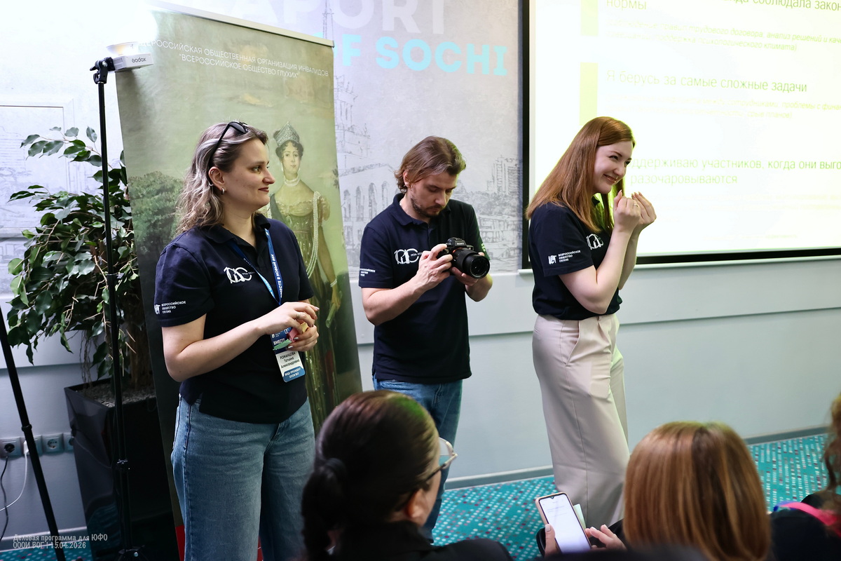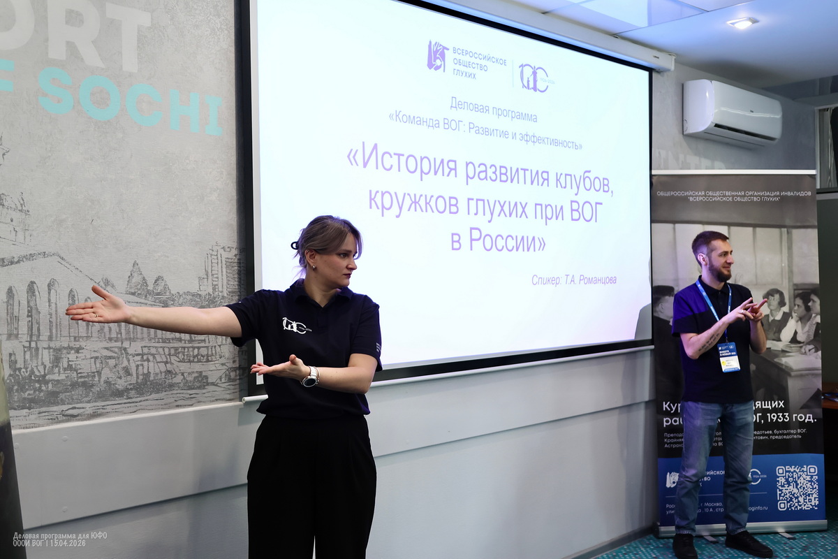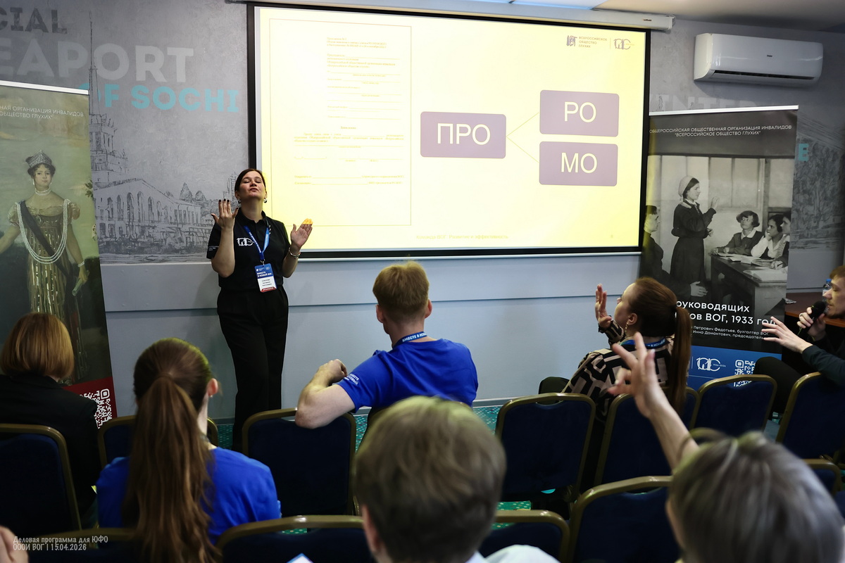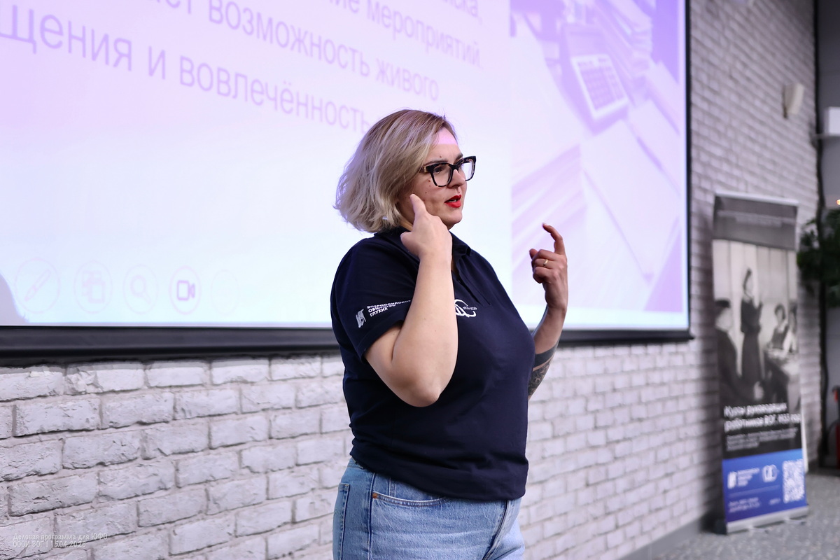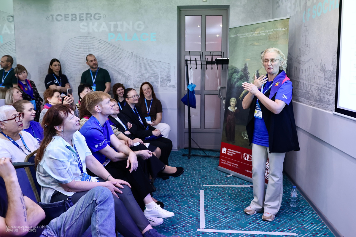 Участники деловой программы делятся множеством личных историй и мотивов — кто-то не мыслит себя без друзей из Общества глухих, кто-то мужа нашёл через ВОГ, кто-то любит заботиться о других, кто-то в ответ начинает допытываться у самой ведущей — а тебе-то зачем?