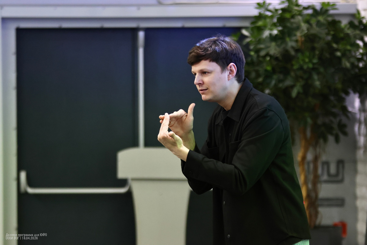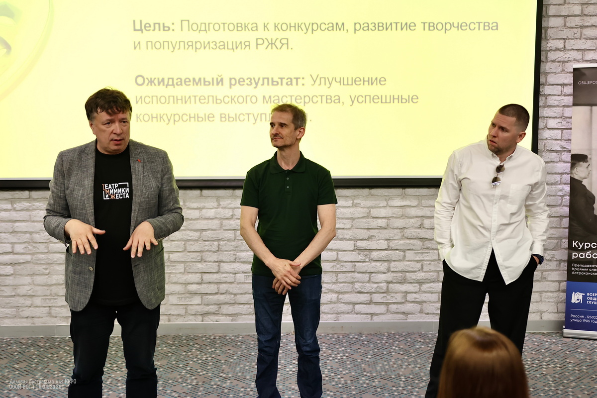 Алексей Лемешев, заместитель директора ТМЖ и главный специалист отдела культуры ВОГ, объяснил цели фестивалей и конкурсов, подчеркнул важность популяризации русского жестового языка и обмена опытом между участниками, указал на типичные ошибки при подаче конкурсных заявок.
