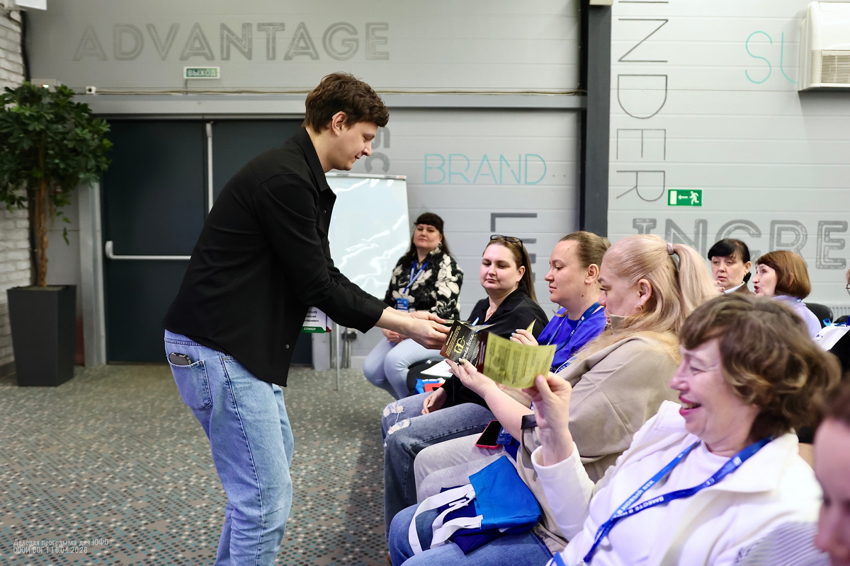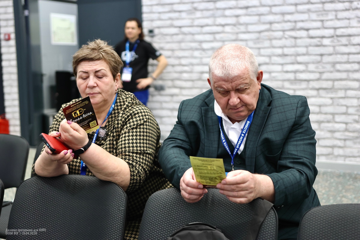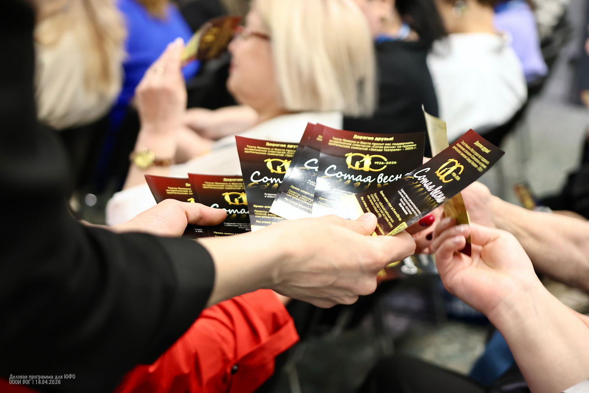 Затем Роберт Фомин и Алексей Лемешев попросили поддержать выдвижение спектакля «Сотая весна» на премию зрительских симпатий «Звезда театрала-2026». Они раздали участникам листовки и помогли сориентироваться с регистрацией и голосованием в электронном виде через сайт.