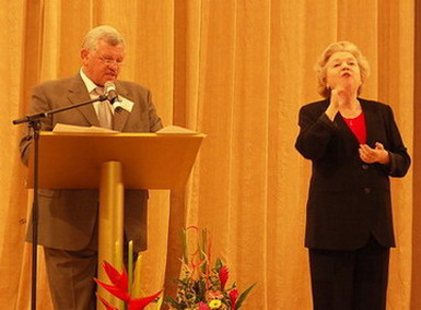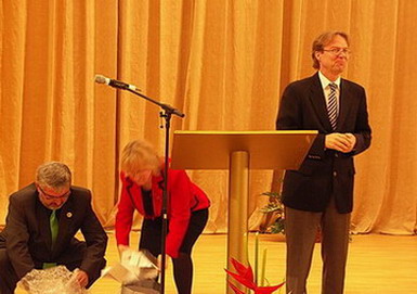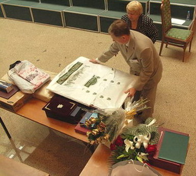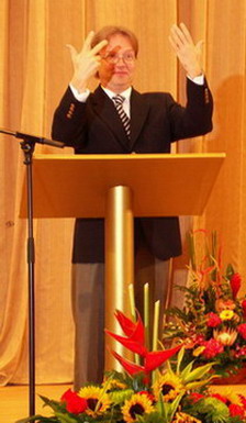После исполнения гимна началась официально-торжественная часть, насыщенная речами, поздравлениями – и подарками! Выступало много важных лиц – от Полномочного представителя Президента РФ в Центральном округе Георгия Полтавченко и представителей различных министерств до главы Всемирной Федерации глухих Маркку Йокинена и президентов братских обществ глухих. В промежутках между выступлениями зачитывались поздравительные телеграммы – в том числе от Владимира Путина.
