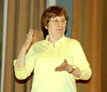 В «работе» Елена Морозова. Она переводит со словесного на жестовый: