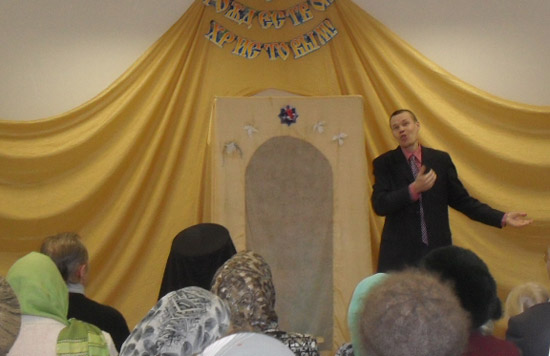 Желающих отметить праздник оказалось достаточно много (примерно 80 чел) – не только участники общины, но и православные члены ВОГ пришли в этот день в Монастырь. С утра в 9 часов была проведена служба, а уже в 11:30 в актовом зале на суд зрителей был показан участниками общины спектакль – «Чудо в Рождество». Первое слово предоставили Иеромонаху Алексею, духовнику православной общины глухих и слабослышащих.