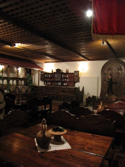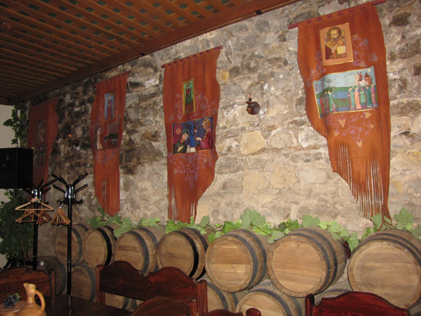 Столовая выполнена в грузинском стиле. Мы видим фрагмент стены, выложенный из природного камня.
